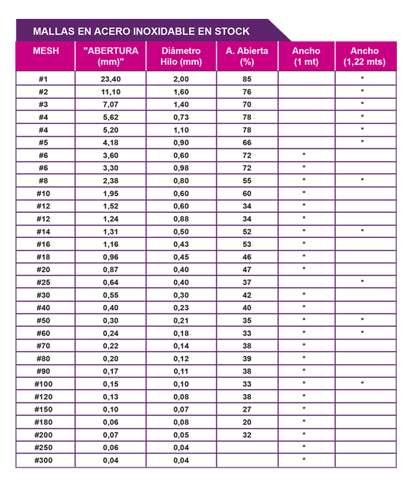 Están formadas por alambres de acero inoxidable calidad 304 que se entrecruzan a intervalos regulares. Contamos con una amplia gama de medidas en acero inoxidable y en acero al carbón, ideal para el manejo de productos secos y separación de mezclas, debido a la exactitud con la que retiene el tamaño de las partículas a filtrar. A la venta por metros o rollo completo.